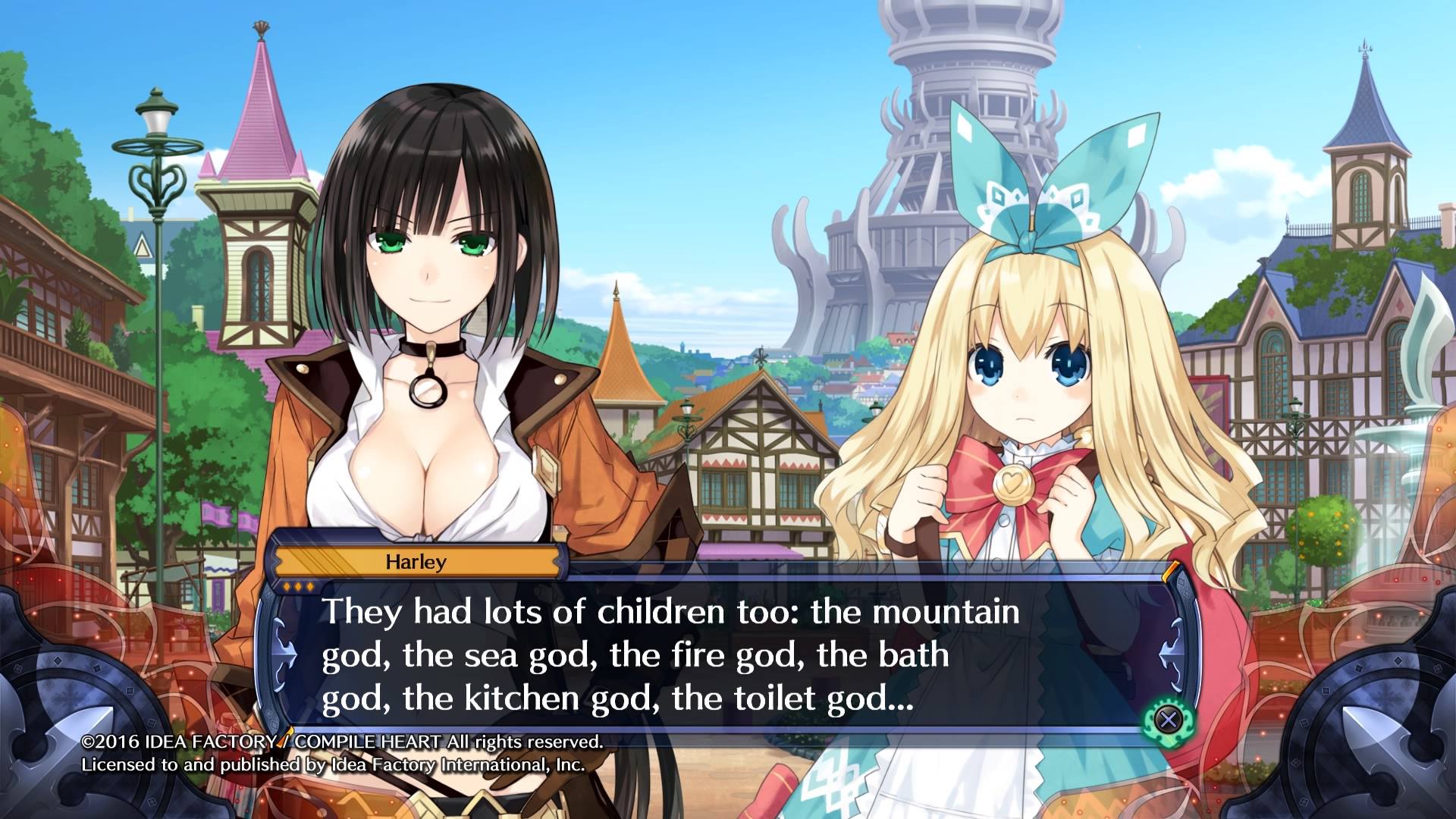 A közepesen érdekes történetet egyébként – általában két kazamata között –, a műfajtól nem idegen módon, szépen megfestett állóképek előtt, a karakterek párbeszédéből ismerhetjük meg. És bár a megoldás olcsónak és avíttnak tűnhet, éppen ezek a dialógusok a játék egyik legerősebb pillérei. A Compile Heart fejlesztői ugyanis hozzák a sablonoktól ugyan nem mentes, de mégis rendkívül szerethető karaktereket, legyen szó a nagy hajszával kapcsolatban szórakoztatóan ignoráns Fangről, az arcátlanul önhitt Tiara hercegnőről, a vaskos akcentussal értetlenkedő Galdóról, vagy a szexuálisan túlfűtött Harleyról. A humor olykor bárgyú, sőt, egyenesen banális, mégis sokszor kaptam magam azon, hogy a képernyő előtt kuncogok.